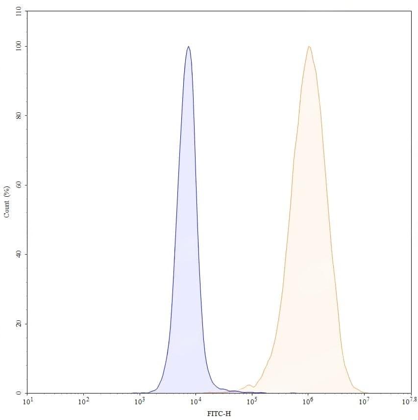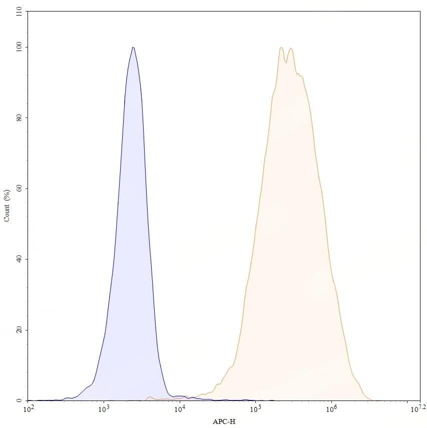 Flow-cytometry using anti-human CD25 antibody. Untransfected cells (blue Histogram) and Transfected cells (Yellow Histogram) were stained with an anti-human CD25 monoclonal antibody (Catalog: HF996136) at a concentration of 5 µg/ml for 30 mins at RT. After washing, bound antibody was detected using a Goat Anti-Human IgG H&L Polyclonal Antibody, FITC (abinScience: HF690414) and cells analysed on a NovoCyte Flow Cytometer. | Flow-cytometry APC using anti-human CD25 antibody. Untransfected cells (blue Histogram) and Transfected cells (Yellow Histogram) were stained with an APC anti-human CD25 monoclonal antibody (Catalog HF996136) at a concentration of 5 µg/ml for 30 mins at RT. After washing, cells analysed on a NovoCyte Flow Cytometer. ### Flow-cytometry PE using anti-human CD25 antibody. Untransfected cells (blue Histogram) and Transfected cells (Yellow Histogram) were stained with an PE anti-human CD25 monoclonal antibody (Catalog HF996136) at a concentration of 5 µg/ml for 30 mins at RT. After washing, cells analysed on a NovoCyte Flow Cytometer.