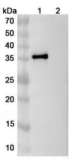 SDS-PAGE for InVivoMAb Anti-Human IL11 Antibody (X203) | Detects recombinant human IL11-SUMO (Catalog No.:TD-HB978022) in indirect ELISA | Western blot analysis was performed using anti-IL11 monoclonal antibody at 1ug/mL on various samples.Lane 1:recombinant human IL11 (Catalog No.:TD-HB978022)Lane 2:negative control