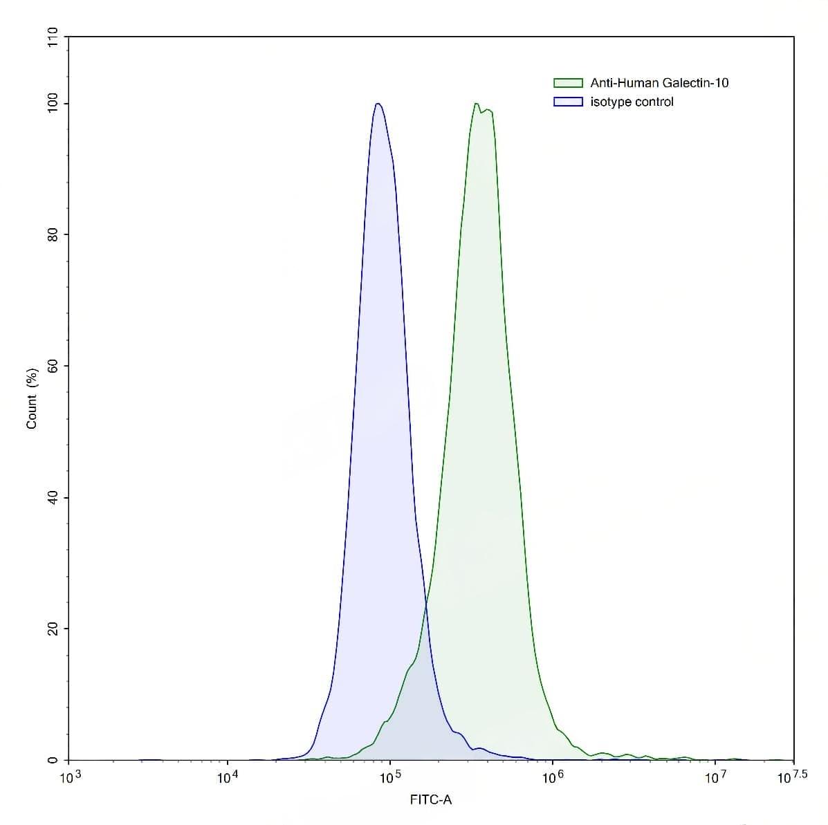 Detects Human GAL10/CLC/Galectin-10 in indirect ELISAs. | Flow-cytometry using anti-human Galectin-10 antibody.HL-60 cells were stained with an irrelevant antibody (Blue Histogram) or an anti-human Galectin-10 antibody monoclonal antibody (Catalog No.:TD-HC313013 ,Green Histogram) at a concentration of 5 µg/ml for 30 mins at RT. After washing, bound antibody was detected using a FITC conjugated goat anti-mouse antibody (Catalog No.:TD-MF690414) and cells analysed on a NovoCyte Flow Cytometer.,Flow-cytometry using anti-human Galectin-10 antibody.HeLa cells were stained with an irrelevant antibody (Blue Histogram) or an anti-human Galectin-10 antibody monoclonal antibody (Catalog No.:TD-HC313013 ,Green Histogram) at a concentration of 5 µg/ml for 30 mins at RT. After washing, bound antibody was detected using a FITC conjugated goat anti-mouse antibody (Catalog No.:TD-MF690414) and cells analysed on a NovoCyte Flow Cytometer.,Flow-cytometry using anti-human Galectin-10 antibody.Human peripheral blood lymphocytes were stained with an irrelevant antibody (Blue Histogram) or an anti-human Galectin-10 antibody monoclonal antibody (Catalog No.:TD-HC313013 ,Green Histogram) at a concentration of 5 µg/ml for 30 mins at RT. After washing, bound antibody was detected using a FITC conjugated goat anti-mouse antibody (Catalog No.:TD-MF690414) and cells analysed on a NovoCyte Flow Cytometer. | SDS-PAGE for Anti-Human Gal-10/CLC Antibody (1D11).