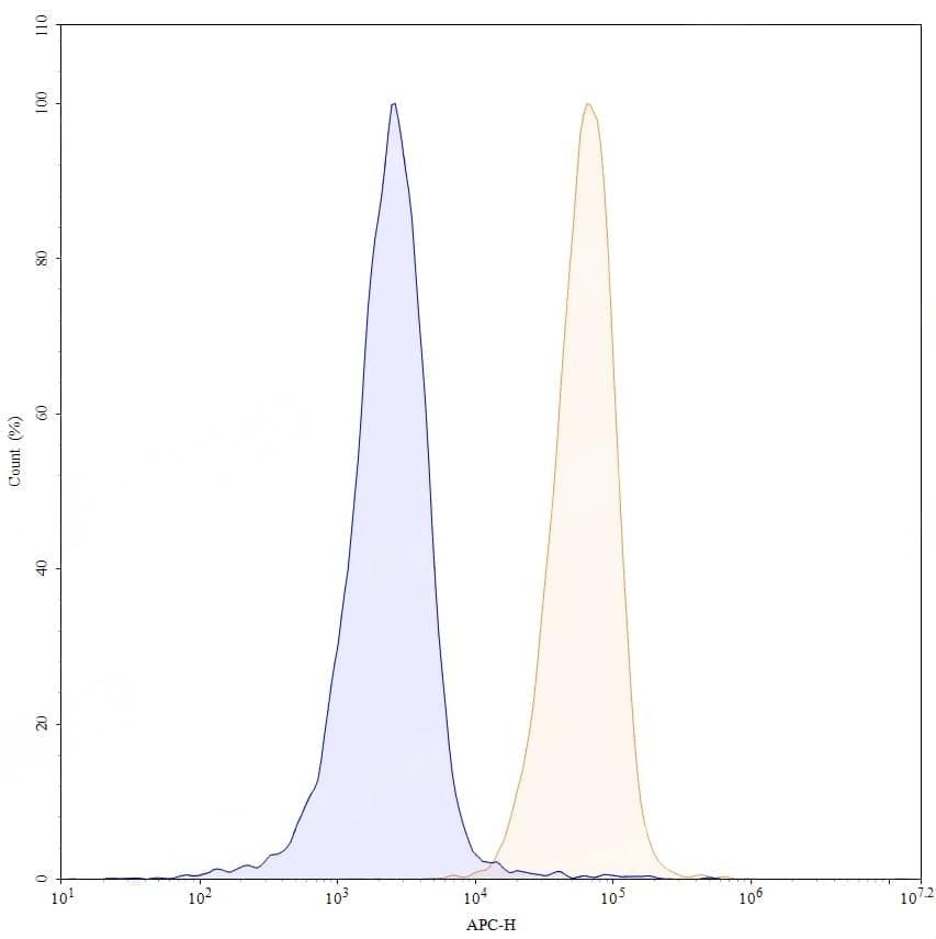 SDS-PAGE for Anti-Human ADGRE1/EMR1/F4/80 Antibody (SAA0811). | Flow-cytometry using APC anti-human EMR1 antibody. Untransfected cells (blue Histogram) and Transfected cells (Yellow Histogram) were stained with an APC anti-human EMR1 monoclonal antibody (Catalog No.:TD-HC268013) at a concentration of 5 µg/ml for 30 mins at RT. After washing, cells analysed on a NovoCyte Flow Cytometer.