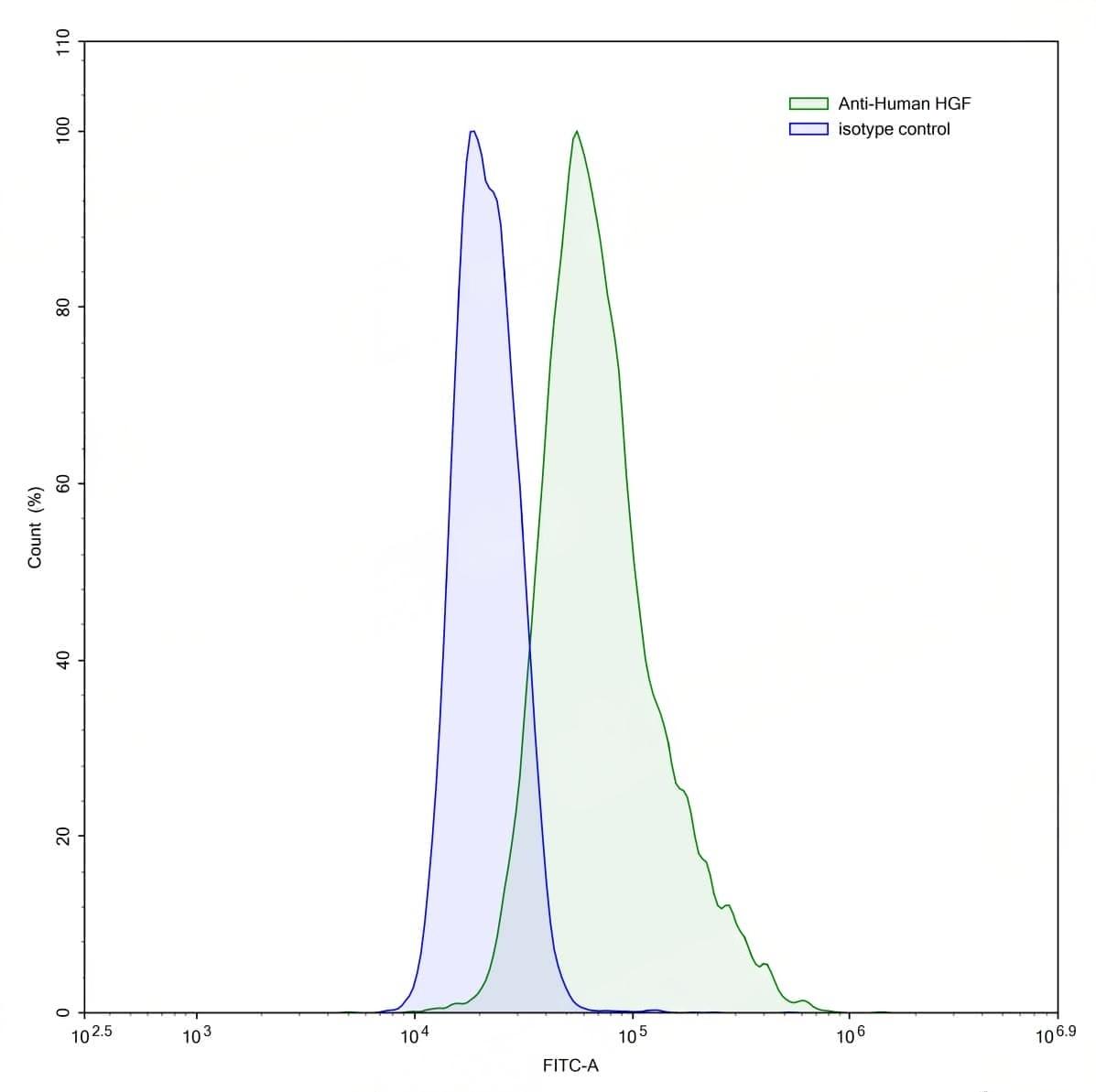 SEC-HPLC detection for InVivoMAb Anti-Human HGF (ABV0082). | Flow-cytometry using anti-human HGF antibody.HGF Transfected CHO cells were stained with an irrelevant antibody (Blue Histogram) or an anti-human HGF antibody monoclonal antibody (Catalog No.:TD-HB191010 ,Green Histogram) at a concentration of 5 µg/ml for 30 mins at RT. After washing, bound antibody was detected using a FITC conjugated goat anti-human antibody (Catalog No.:TD-HF690414) and cells analysed on a NovoCyte Flow Cytometer. | SDS-PAGE for InVivoMAb Anti-Human HGF (Iv0065).