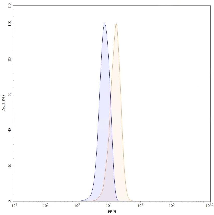 SDS-PAGE for Anti-Human FABP4/aP2 Antibody (CA33). | Flow-cytometry using PE anti-human FABP4 antibody. Hela cells were fixed and permeabilized, then stained with an irrelevant antibody (Blue Histogram) or an PE anti-human FABP4 monoclonal antibody (Catalog No.:TD-HB171013, Yellow Histogram) at a concentration of 5 µg/ml for 30 mins at RT. After washing, cells analysed on a NovoCyte Flow Cytometer. | Western blot analysis was performed using anti-FABP4 monoclonal antibody at 1µg/ml on various samples.Lane 1:recombinant human FABP4 (Catalog No.:TD-HB171012)Lane 2:negative control