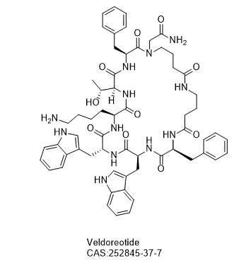 Veldoreotide (DG3173) 一种生长抑素类似物,可结合并激活生长抑素受体 (SSTR) 2/4/5。与 Octreotide 相比,Veldoreotide 在腺瘤中抑制生长激素分泌的比例更高。Veldoreotide 有被用作镇痛剂的潜力。