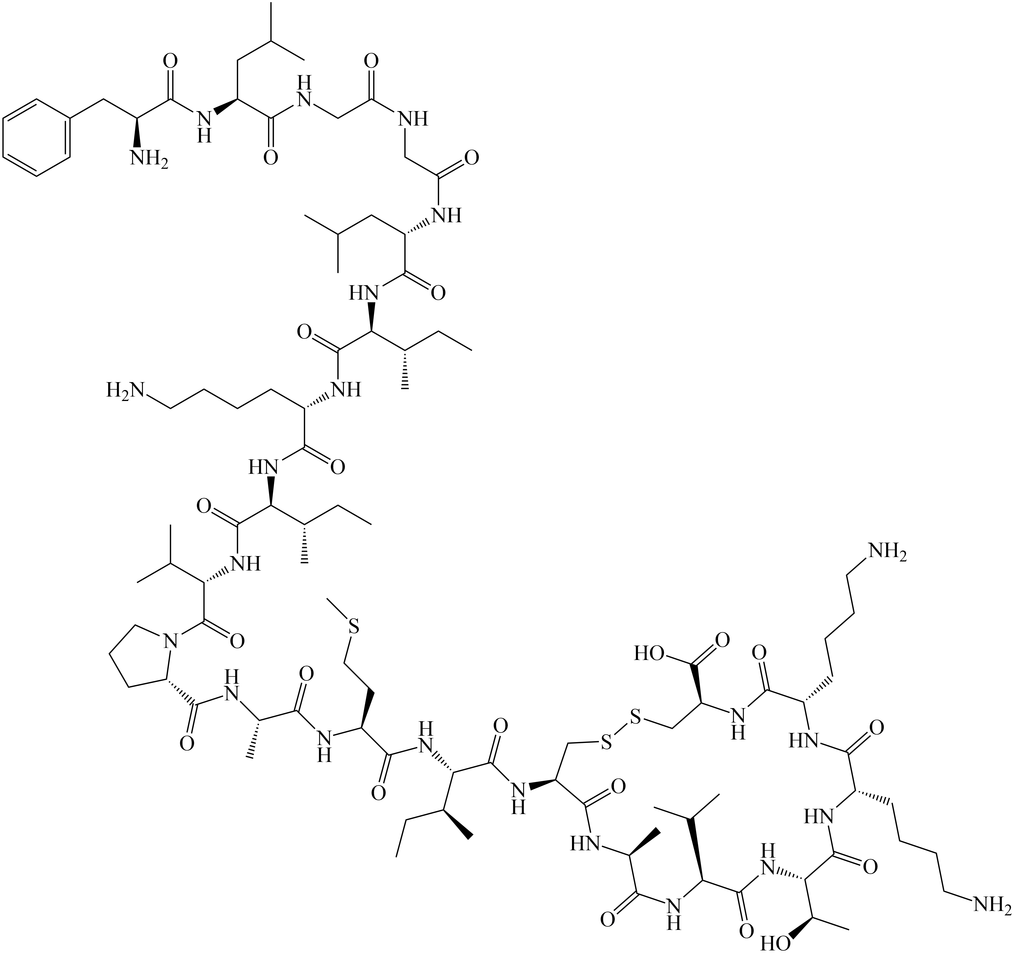 从美洲牛蛙(Ranacatesbeiana)的皮肤中分离得到的Ranalexin是一种两栖抗菌肽。它含有一个分子内二硫键,在分子内形成一个七肽环。从结构上看,雷纳滨类似于细菌抗生素多粘菌素,它含有类似的七肽环。