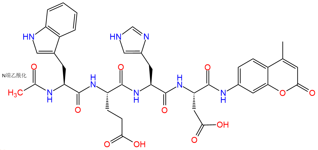 kcat/Km为3.3·10⁶ M⁻¹s⁻¹荧光半胱天冬酶-1底物Ac-WEHD-AMC比Ac-YVAD-AMC切割效率高50倍。该结果表明,caspase-1的最佳四肽识别序列是Trp-Glu-His-Asp,而不是Tyr-Val-Ala-Asp。