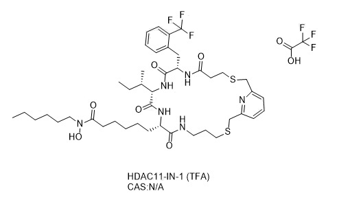 HDAC11-IN-1 (Compound 14-NC6OH) TFA 是一种选择性 HDAC11 的大环抑制剂,Ki 为 40 nM。HDAC11-IN-1 TFA 具有良好的细胞穿透性且能抑制 YAP1 和 SOX2 的表达。