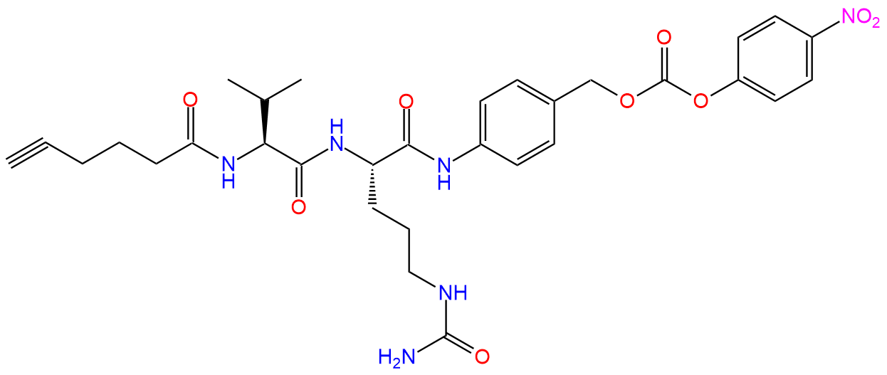 炔烃-Val-Cit-PAB-PNP是一种可裂解的ADC接头,含有末端炔烃、缬氨酸-瓜氨酸(Val-Cit二肽)和对硝基苯基(PNP)碳酸酯。炔基是一种点击化学手柄,它很容易与目标分子上的叠氮化物基团反应,形成稳定的三唑键,而PNP可用于与胺反应。Val-Cit连接子被细胞质肽酶切割。