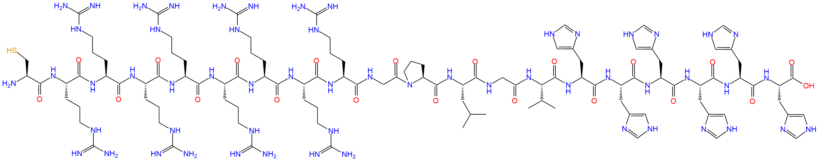 H2N-Cys-Arg-Arg-Arg-Arg-Arg-Arg-Arg-Arg-Gly-Pro-Leu-Gly-Val-His-His-His-His-His-His-OH