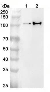Western blot analysis was performed using anti-USP4 polyclonal antibody at 1ug/mL on various samples.Lane 1:Hela cell lysateLane 2:Jurkat cell lysate