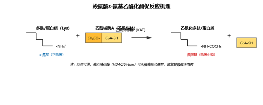 以下是最常见的N-末端及赖氨酸 ε- 氨基乙酰化酶促反应示意图,清晰展示了修饰的完整过程: