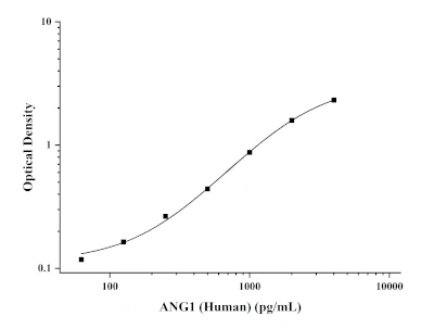 本试产品采用双抗体夹心ELISA法。用抗Human ANG1抗体包被于酶标板上,实验时样品(或标准品)中的Human ANG1会与包被抗体结合。后依次加入生物素化的抗Human ANG1抗体和HRP酶标记的亲和素,抗Human ANG1抗体与结合在包被抗体上的Human ANG1结合,生物素与亲和素特异性结合而形成免疫复合物,游离的成分被洗去。加入显色底物(TMB),TMB在HRP酶的催化下呈现蓝色,加终止液后变成黄色。用酶标仪在450 nm波长处测OD值,Human ANG1浓度与OD450 OD值之间呈正比,通过绘制标准曲线计算出样品中Human ANG1的浓度。