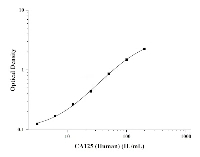 本试产品采用双抗体夹心ELISA法。用抗Human CA125抗体包被于酶标板上,实验时样品(或标准品)中的Human CA125会与包被抗体结合。后依次加入生物素化的抗Human CA125抗体和HRP酶标记的亲和素,抗Human CA125抗体与结合在包被抗体上的Human CA125结合,生物素与亲和素特异性结合而形成免疫复合物,游离的成分被洗去。加入显色底物(TMB),TMB在HRP酶的催化下呈现蓝色,加终止液后变成黄色。用酶标仪在450 nm波长处测OD值,Human CA125浓度与OD450 OD值之间呈正比,通过绘制标准曲线计算出样品中Human CA125的浓度。
