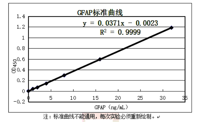 此人神经角质纤维酸性蛋白(H-GFAP)定量检测试剂盒,采用抗H-GFAP的单克隆配对抗体分别作为包被抗体和检测抗体,组成双抗体夹心ELISA检测模型,样品孔OD值大小和样品中GFAP的含量呈正相关。本试剂盒检测下限为1ng/mL。