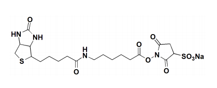 Sulfo-NHS-LC-Biotin, Sulfosuccinimidyl6-(biotinamido) Hexanoate, is a long chain water soluble biotinylation reagentthat is reactive toward primary amine groups. Similar to Sulfo-NHSBiotin(b2100-100mg and b2100-1gm), Sulfo-NHS-LC-Biotin is designed to target cellsurface proteins. The sodium sulfonate groups lend water solubility toSulfo-NHS-LC-Biotin and prevent it from crossing the lipid bi-layer of the cellmembrane.