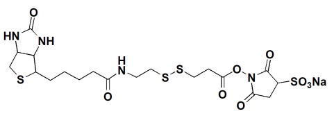 Sulfosuccinimidyl-2-(biotinamido)-ethyl-1,3-dithiopropionate(Sulfo-NHS-SS-Biotin) is a cleavable, water-soluble, amino-reactivebiotinylation reagent. This molecule is cell membrane impermeable due to itssodium sulfonate group. Sulfo-NHS-SS-Biotin has a long chain spacer arm separatingthe biotin group from the amino-reactive sulfo-NHS ester moity. It is possibleto cleave the biotin group from the crosslinked target protein under reducingconditions, such as in the presence of BME, DTT or TCEP.