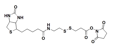 NHS-SS-Biotin,Succinimidyl-2-(biotinamido)-ethyl-1,3'-dithiopropionate, is an amine-reactive biotinylationreagent that contains a reducible disulfide. NHS-SS-Biotin is cell membranepermeable and has a long chain separating the biotin group from theamino-reactive NHS-ester (NHydroxysuccinimide ester). This product is oftenused to purify an antibody or other protein from a biotin specific affinityresin like immobilized streptavidin without exposing your protein of interestto denaturing conditions.