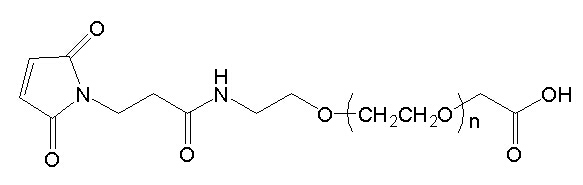 Maleimide PEG acid (Maleimide-PEG-COOH) is a thiol reactive heterobifunctional PEG derivative. Maleimide groups react with sulfhydryl groups at pH 6.5~7.5 at room temperature to form stable thioether bonds, while carboxylic acid groups on the other end can react with amine and acid amine reactive molecues.