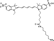 Sulfo Cy7 amine Cyanine7 amine NH2是一种水溶性的的CY7荧光活性染料,可以和带有NHS琥珀酰亚胺脂的多肽、蛋白、抗体、核酸或者其他小分子连接
