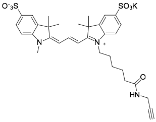 A water soluble alkyne dye for copper catalyzed Click Chemistry, an analog of Cy3® alkyne.Sulfo-Cyanine3 is a fluorophore which is compatible with a wide range of fluorescent scanners, imagers, microscopes, and other instrumentation. It is a bright and photostable dye, which is also easily detected in gels by naked eye in low amounts (<1 nmol).