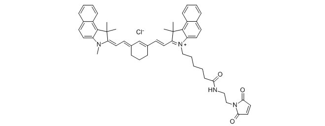 Thiol-reactive, near infrared dye Cyanine7.5 for the labeling of protein SH groups, an analog of Cy7.5® maleimide.Most proteins contain sulfhydryl groups which can be selectively labeled with maleimides. With this reagent, these proteins can be converted to near infrared (NIR) fluorescent conjugates. After it, the conjugates can be used in non-invasive live organism imaging to study distribution of the protein in tissues and organs.