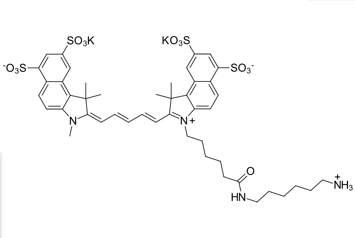 Sulfo-Cyanine5.5 is a water soluble cyanine dye for far red / NIR applications such as in vivo imaging. The dye possesses four sulfonate groups that render it highly hydrophilic and water soluble. As well as other cyanines, sulfo-Cyanine5.5 has an outstanding extinction coefficient that makes it a bright fluorescent label for the far red region.This is an amine-containing fluorescent dye. The amine group is separated from the fluorophore by a relatively long linker that facilitates conjugation. The aliphatic primary amine group can be coupled with various electrophiles (activated esters, epoxides, etc), and also be used in enzymatic transamination labeling.