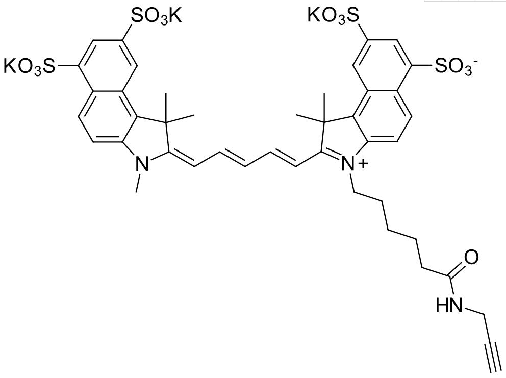 Sulfo-Cyanine5.5 is a far red emitting fluorophore. It contains four sulfo groups, which provide great hydrophilicity, and aqueous solubility. The reagent can be conjugated with a variety of azides by means of copper catalyzed Click chemistry reaction.