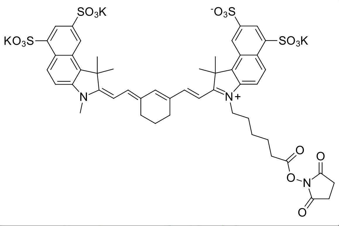 Sulfo-Cyanine7.5 is a near infrared water soluble and hydrophilic dye for the NIR imaging applications. The structure and spectra of the dye resemble indocyanine green (ICG) that has been approved for use in humans for years. However, unlike ICG, sulfo-Cyanine7.5 contains a trimethylene bridge that increases its quantum yield compared to ICG, and also has a linker arm for its attachment to proteins, peptides, and other molecules. This derivative is an NHS ester for the modification of amine groups.Excitation /Emission maximum 780-800nm