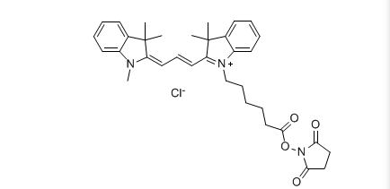 Cyanine3 NHS ester is a reactive dye for the labeling of amino-groups in biomolecules, an analog of Cy3® NHS ester. This reagent is ideal for the labeling of soluble proteins, peptides, and oligonucleotides/DNA. For delicate proteins consider usingwater-solublesulfo-Cyanine3 NHS esterwhich does not requireuse of any co-solvent.