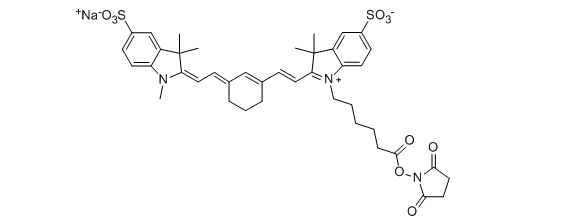 Water soluble near infrared dye sulfo-Cyanine7, an amine-reactive succinimide ester.Sulfo-Cyanine7 is an improved analog of Cy7® fluorophore with quantum yield improved by 20%, and higher photostability. This fluorescent dye is especially useful for NIR imaging.Near infrared fluorescent imaging takes advantage of transparency of biological tissues at particular range of wavelengths. The method is non-destructive, and allows to monitor distribution of various labeled molecules in live organisms.Sulfo-Cyanine7 NHS ester reagent allows to prepare sulfo-Cyanine7-labeled biomolecules, such as proteins, with ease. Dye labeled molecules can be subsequently used for various research and drug design related experiments.This reagent has high water solubility, and is especially useful for the labeling of delicate proteins, and proteins prone to denaturation. Non-sulfonatedCyanine7 NHS estersoluble in organic phase is also available.