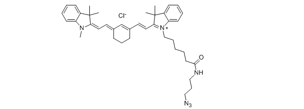 Cyanine7 azide is a near-infrared fluorescent dye azide for Click Chemistry labeling, an analog of Cy7® azide.This product can be used for the incorporation of Cyanine7 into various alkynylated biomolecules via Click Chemistry. Post-synthetic modification of oligonucleotides is also possible with this azide.Cyclohexane-bridged polymethyne chain allows for 20% increase in quantum yield (compared to parent non-bridged structure).