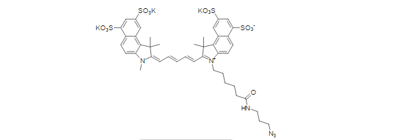 Sulfo-Cyanine5.5 is a water-soluble, hydrophilic fluorophore which possesses emission in far red area of the spectrum, an analog of Cy5.5®. As other cyanine dyes, sulfo-Cyanine5.5 has an outstanding molar extinction coefficient which gives rise to its bright fluorescence.The molecule contains four sulfo groups that provide hydrophilicity and negative charge to the fluorophore - this minimizes non-specific binding.The azide group of sulfo-Cyanine5.5 azide can be conjugated with terminal alkynes in the presence of copper(I) catalyst, or with cycloalkynes in copper free strain promoted reaction.