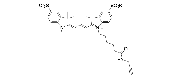 A water soluble alkyne dye for copper catalyzed Click Chemistry, an analog of Cy3® alkyne.Sulfo-Cyanine3 is a fluorophore which is compatible with a wide range of fluorescent scanners, imagers, microscopes, and other instrumentation. It is a bright and photostable dye, which is also easily detected in gels by naked eye in low amounts (<1 nmol).