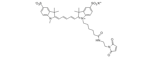 A water soluble, hydrophilic sulfo-Cyanine5 maleimide (Cy5® maleimide analog). We recommend this product for protein labeling, including labeling of antibodies as a perfect replacement for Cy5® maleimide. Labeled proteins can be easily separated from unreacted dye by gel filtration, spin column purification, dialysis, electrophoresis or chromatography.An analog without sulfo groups, Cyanine5 maleimide, is also available.