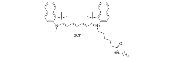 Cyanine5.5 hydrazide is a carbonyl-reactive near infrared dye. Hydrazides quickly react with carbonyl compounds, such as aldehydes and ketones, and form stable hydrazones. This reaction is useful for the preparation of labeled conjugates.Carbonyl groups in biomolecules can form spontaneously after oxidative stress or deamination of proteins. Alternatively, aldehyde groups can be specifically generated by periodate oxidation of sugar residues of glycoproteins, for example antibodies. Antibodies can be oxidized by sodium periodate and labeled with Cyanine5.5 hydrazide to form Cyanine5.5 labeled antibodies. Since sugar residues in antibodies are located far from variable, epitope-binding site, this method is particularly good for the labeling of antibodies.Cyanine5.5 is a near infrared fluorophore, an analog of Cy5.5®. It is particularly suitable for the applications which require low fluorescence background. The absorption and emission wavelength of the dye exhibit significant tissue penetration, so Cyanine5.5 is suitable for in vivo NIR imaging applications.