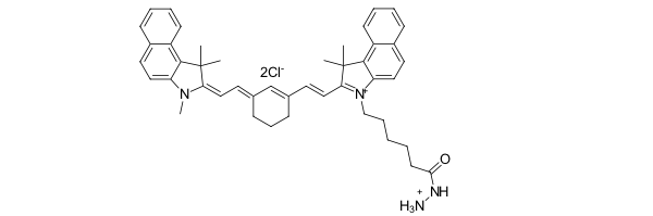 A carbonyl-reactive hydrazide derivative of Cyanine7.5 near infrared (NIR) fluorophore. This dye has similar spectral properties with ICG (indocyanine green), but has a higher quantum yield of fluorescence. Hence, this fluorophore is ideal for in vivo imaging.This is a carbonyl-reactive dye which is particularly useful for the labeling of antibodies after periodate oxidation. It also labels other carbonyl compounds (aldehydes and ketones), for example, many saccharides.