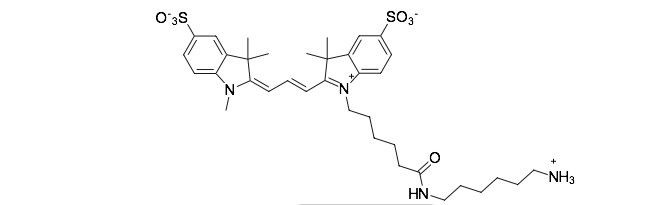 A water soluble dye with amino group, useful for the conjugation with electrophiles, and for enzymatic transamination labeling.Sulfo-Cyanine3 is a sulfonated analog of Cy3®, which is compatible with various fluorescence measuring equipment. The dye is highly photostable. It is also easily detectable by naked eye.