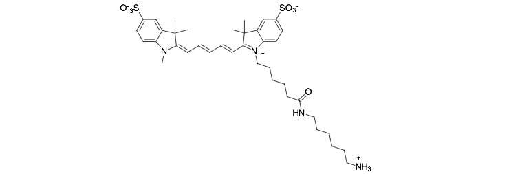 Water soluble amino dye for enzymatic transamination labeling, and other coupling with electrophiles. Cyanine5 is a popular fluorophore which is compatible with different fluorescence measuring instruments.Sulfo-Cyanine5 derivatives possess good water solubility.