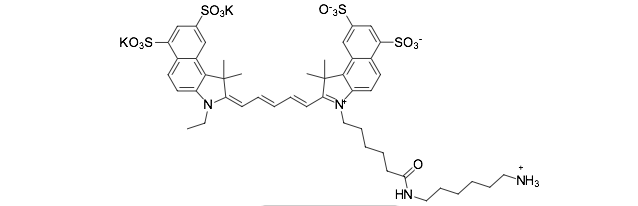 Sulfo-Cyanine5.5 is a water soluble cyanine dye for far red / NIR applications such as in vivo imaging. The dye possesses four sulfonate groups that render it highly hydrophilic and water soluble. As well as other cyanines, sulfo-Cyanine5.5 has outstanding extinction coefficient that makes it bright fluorescent label for far red region.This is amine-containing fluorescent dye. The amine group is separated from the fluorophore by a relatively long linker that facilitates conjugation. The aliphatic primary amine group can be coupled with various electrophiles (activated esters, epoxides, etc), and also used in enzymatic transamination labeling.